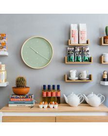 A modern Scandinavian-inspired wall clock with a pale plywood case and a contemporary ‘Bubble Green’ dial with minimalist graphic numerals.Available in a range of muted colour-block options, the Mr Clarke collection creates a contemporary focal point in the kitchen, living room or office.Please note, this clock is made from real wood so there may be slight variations in the colour and grain as well as some natural wood knots, lines and joins. Works with AA batteries (not included)