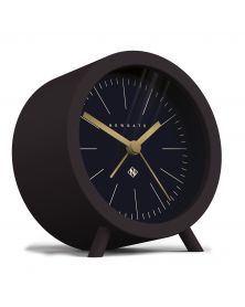A mid-Century modern alarm clock in 'Chocolate Black'. A matt silicone-finish barrel case rests on angled legs, with a minimalist petrol blue marker dial and digital beep alarm. Known as ‘silent sweep’ in the industry, the hands move in a constant sweeping motion rather than a stepped tick. So you won’t hear any ticking but if your hearing is particularly sensitive in a completely silent room you may hear a very quiet whirring. Works with AA batteries (not included)